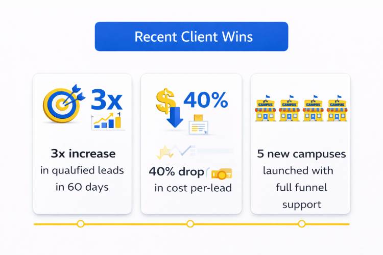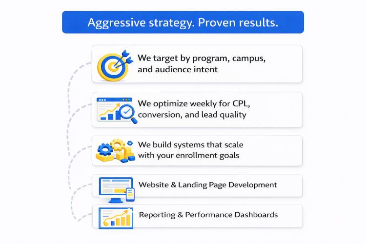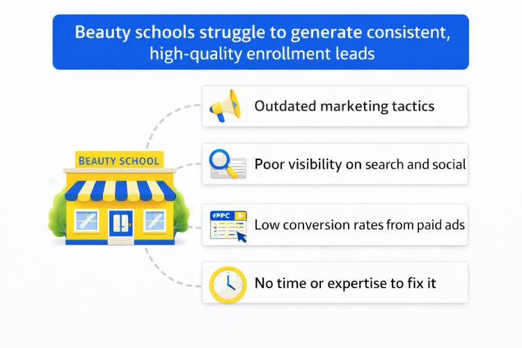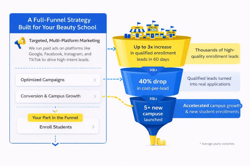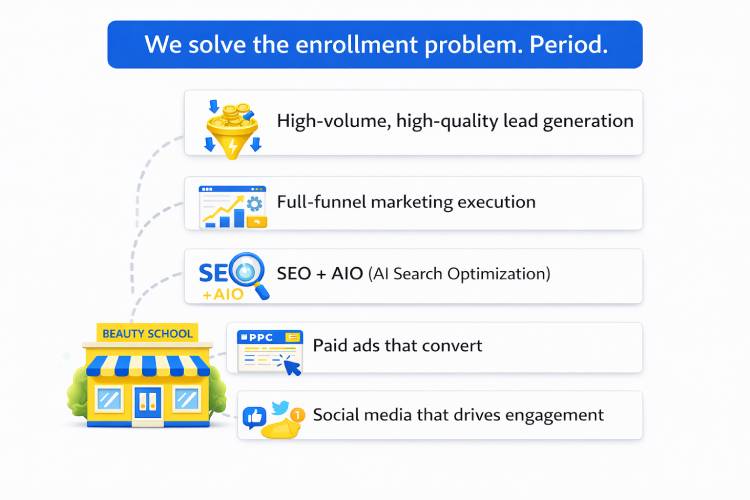 Running a beauty school means juggling programs, campuses, staff, and enrollments. Marketing should not be another guessing game. We help beauty school owners and admissions directors generate consistent, high-quality enrollment leads through targeted strategy, proven paid ads, SEO and AI search optimization, and systems built to scale. Every campaign is designed around your programs, your campuses, and real student intent so your team spends less time chasing leads and more time enrolling the right students.